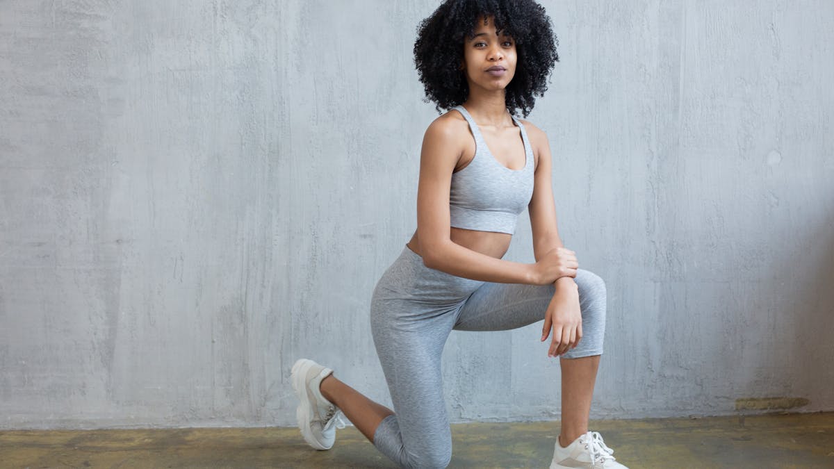 - Begin in a lunge position with one foot forward and one foot back, both knees at 90-degree angles.
